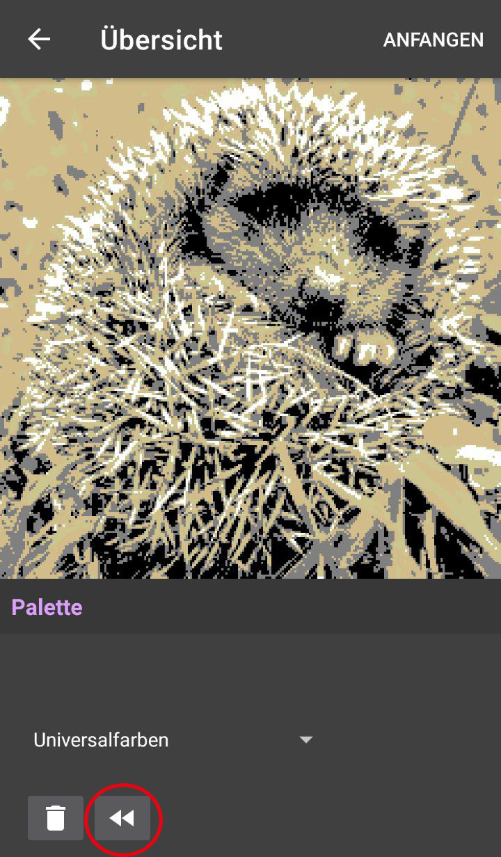 Um ein Projekt zurückzusetzen, drücke in der Projektübersicht den Rewind-Button am unteren Bildschirmrand.